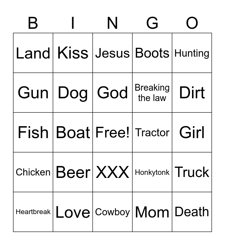 This bingo card has a free space and 24 words: Beer, Love, God, Heartbreak, Hunting, Land, Gun, Kiss, Tractor, XXX, Breaking the law, Fish, Honkytonk, Truck, Dog, Mom, Girl, Jesus, Dirt, Boat, Death, Chicken, Boots and Cowboy.