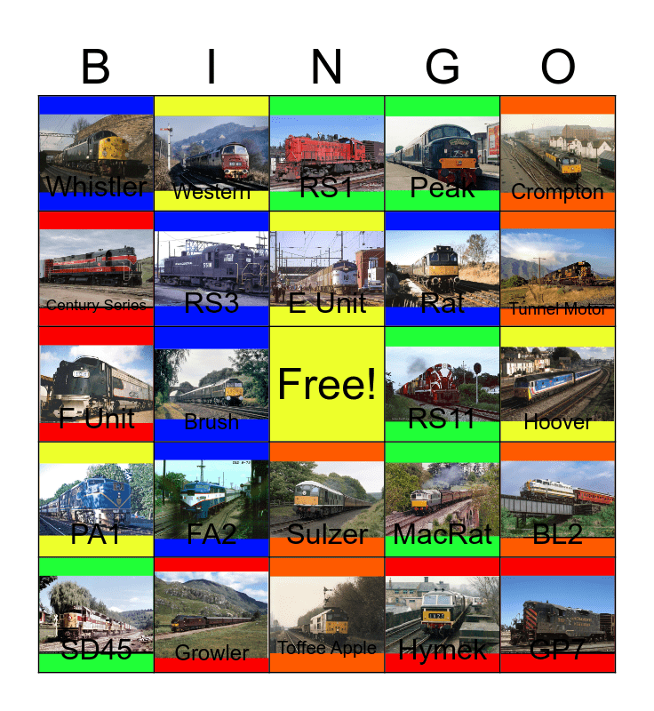 This bingo card has 24 images, a free space and 24 words: FA2, Growler, E Unit, SD45, Crompton, Whistler, Century Series, Western, RS11, Sulzer, Rat, F Unit, MacRat, BL2, RS3, Hymek, Hoover, RS1, Tunnel Motor, Brush, GP7, PA1, Peak and Toffee Apple.