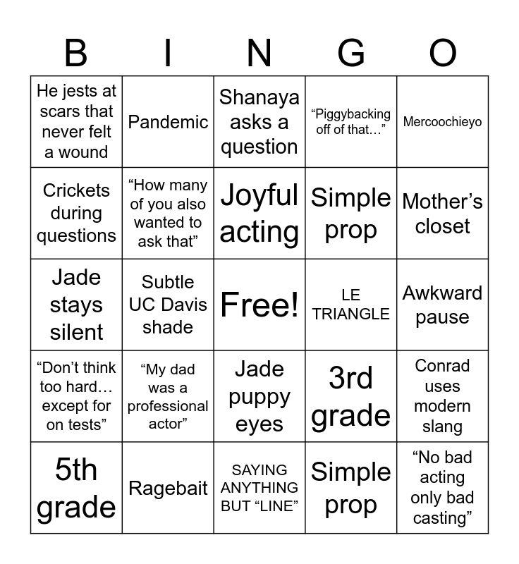 This bingo card has a free space and 24 words: 5th grade, “My dad was a professional actor”, Joyful acting, Simple prop, Mercoochieyo, He jests at scars that never felt a wound, Pandemic, Shanaya asks a question, LE TRIANGLE, Awkward pause, Jade stays silent, “How many of you also wanted to ask that”, 3rd grade, Conrad uses modern slang, Crickets during questions, Ragebait, SAYING ANYTHING BUT “LINE”, “Piggybacking off of that…”, Mother’s closet, “Don’t think too hard… except for on tests”, Subtle UC Davis shade, Jade puppy eyes, Simple prop and “No bad acting only bad casting”.