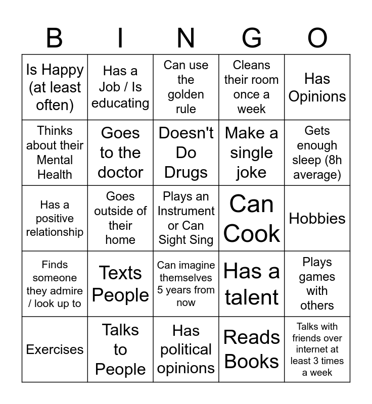 This bingo card has a free space and 24 words: Texts People, Talks to People, Doesn't Do Drugs, Exercises, Has Opinions, Is Happy (at least often), Thinks about their Mental Health, Has a Job / Is educating, Can Cook, Can imagine themselves 5 years from now, Make a single joke, Has a positive relationship, Has a talent, Plays games with others, Goes to the doctor, Reads Books, Hobbies, Can use the golden rule, Gets enough sleep (8h average), Goes outside of their home, Talks with friends over internet at least 3 times a week, Finds someone they admire / look up to, Cleans their room once a week and Has political opinions.