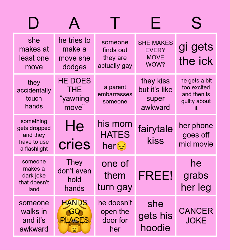 This bingo card has 1 images and 25 words: They don’t even hold hands, he doesn’t open the door for her, a parent embarrasses someone, someone walks in and it’s awkward, gi gets the ick, she makes at least one move, they accidentally touch hands, he tries to make a move she dodges, fairytale kiss, one of them turn gay, they kiss but it’s like super awkward, something gets dropped and they have to use a flashlight, FREE!, he grabs her leg, HE DOES THE “yawning move”, CANCER JOKE, her phone goes off mid movie, someone finds out they are actually gay, he gets a bit too excited and then is guilty about it, He cries, his mom HATES her😔, HANDS GO PLACES😧, someone makes a dark joke that doesn’t land, SHE MAKES EVERY MOVE WOW? and she gets his hoodie.