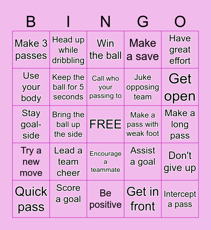 This bingo card has a free space and 24 words: Lead a team cheer, Score a goal, Call who your passing to, Quick pass, Have great effort, Make 3 passes, Use your body, Head up while dribbling, Make a pass with weak foot, Encourage a teammate, Juke opposing team, Stay goal-side, Assist a goal, Don't give up, Keep the ball for 5 seconds, Get in front, Make a long pass, Win the ball, Get open, Bring the ball up the side, Intercept a pass, Try a new move, Make a save and Be positive.