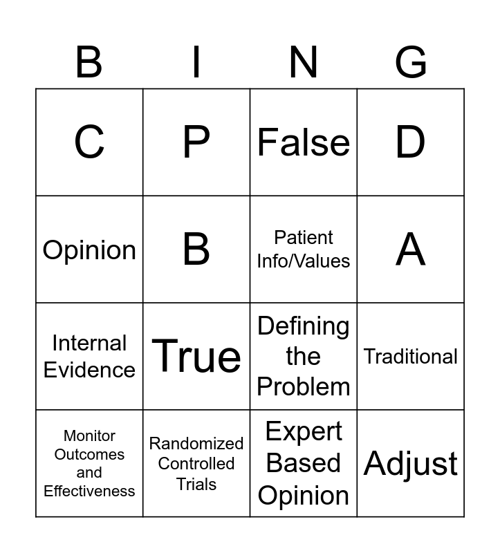This bingo card has 16 words: Randomized Controlled Trials, Traditional, False, C, Internal Evidence, P, Defining the Problem, Expert Based Opinion, Opinion, B, Monitor Outcomes and Effectiveness, D, True, A, Patient Info/Values and Adjust.
