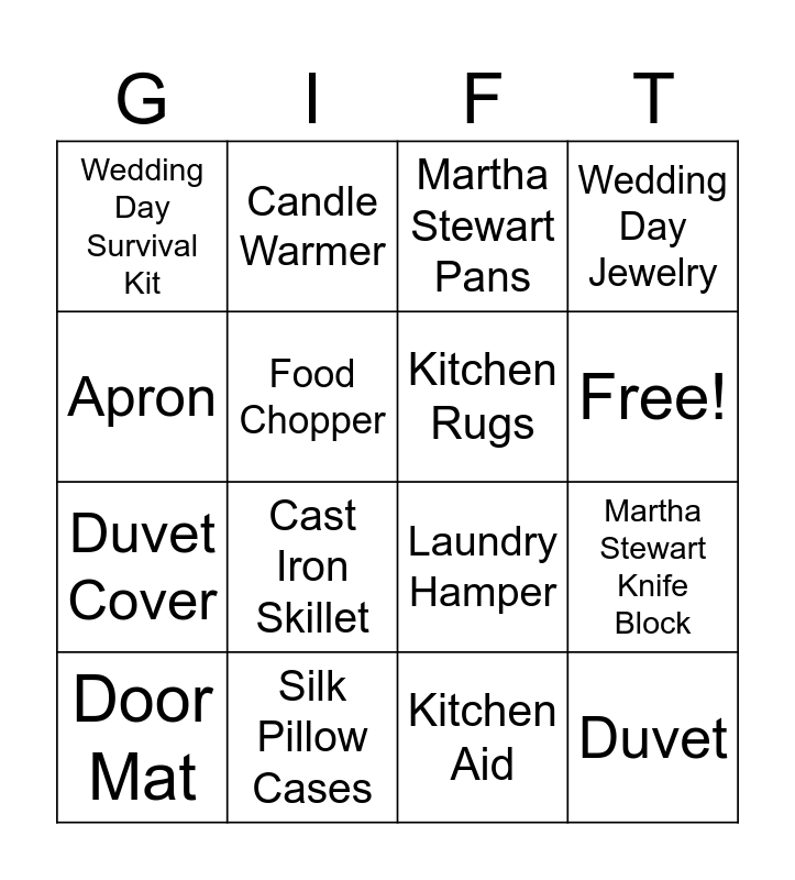 This bingo card has 18 words: Cast Iron Skillet, Duvet, Martha Stewart Pans, Wedding Day Survival Kit, Laundry Hamper, Wedding Day Jewelry, Door Mat, Candle Warmer, Free!, Duvet Cover, Kitchen Aid, Apron, Martha Stewart Knife Block, Food Chopper, Kitchen Rugs, Cookbook Stand, Silk Pillow Cases and Personalized Bible.