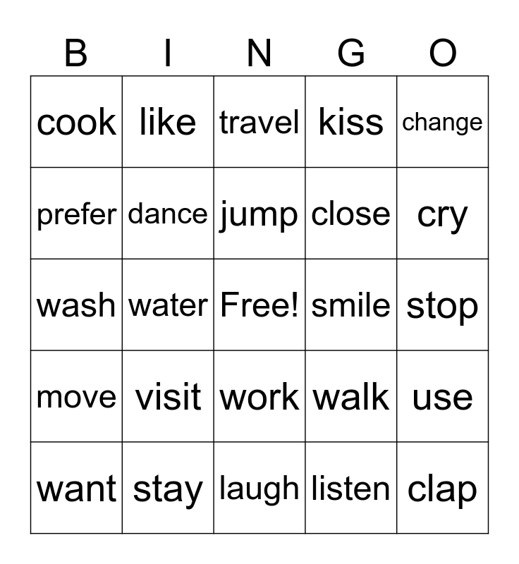 This bingo card has a free space and 34 words: play, listen, watch, study, move, dance, change, want, like, talk, jump, travel, paint, travel, smile, cry, stay, wash, visit, walk, work, help, cook, stop, laugh, clap, kiss, open, close, prefer, act, water, use and call.