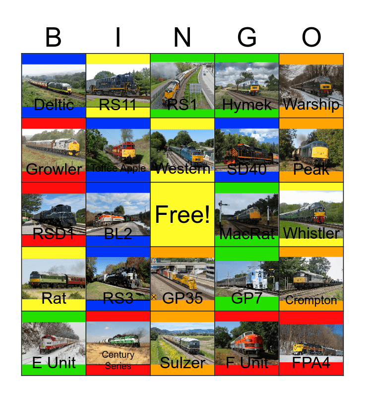 This bingo card has 24 images, a free space and 24 words: RS3, Century Series, Western, E Unit, Warship, Deltic, Growler, RS11, MacRat, GP35, SD40, RSD1, GP7, Crompton, Toffee Apple, F Unit, Whistler, RS1, Peak, BL2, FPA4, Rat, Hymek and Sulzer.