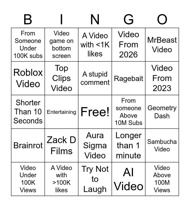 This bingo card has a free space and 24 words: Zack D Films, A Video with >100K likes, A stupid comment, Video Under 100K Views, MrBeast Video, From Someone Under 100K subs, Roblox Video, Video game on bottom screen, From someone Above 10M Subs, Aura Sigma Video, Ragebait, Shorter Than 10 Seconds, Longer than 1 minute, Sambucha Video, Top Clips Video, AI Video, Geometry Dash, A Video with <1K likes, Video From 2023, Entertaining, Video Above 100M Views, Brainrot, Video From 2026 and Try Not to Laugh.