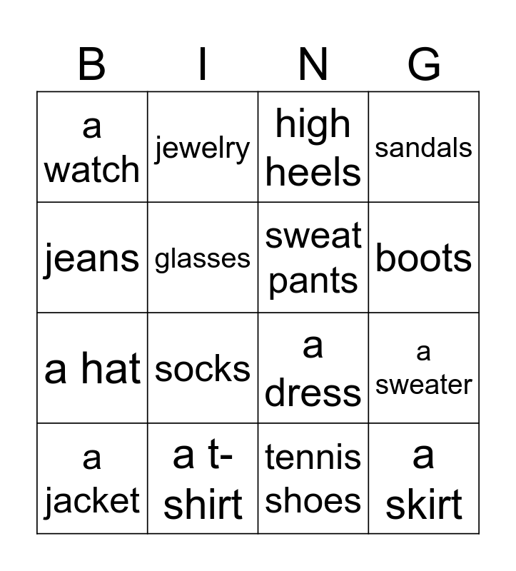 This bingo card has 16 words: a t-shirt, a sweater, high heels, a watch, a hat, jewelry, a dress, tennis shoes, jeans, glasses, a jacket, sandals, socks, boots, sweat pants and a skirt.