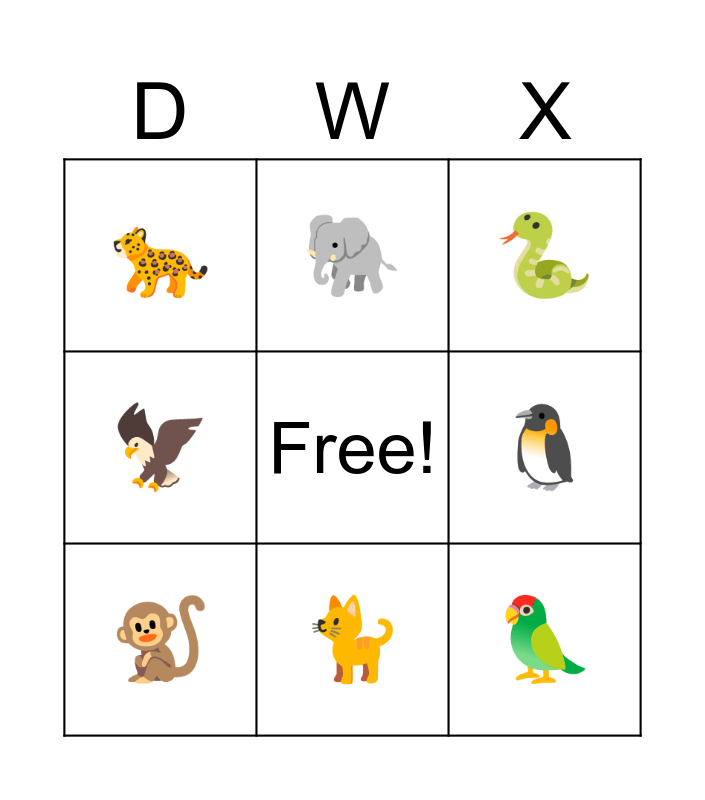 This bingo card has a free space and 8 words: 🐧, 🐍, 🐘, 🐒, 🐆, 🦜, 🦅 and 🐈.