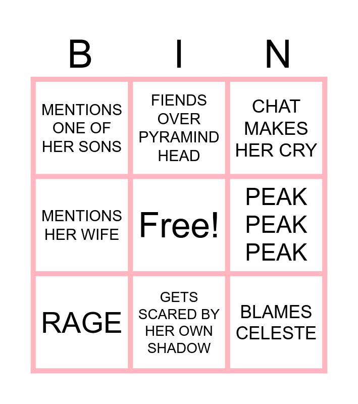 This bingo card has a free space and 8 words: PEAK PEAK PEAK, CHAT MAKES HER CRY, FIENDS OVER PYRAMIND HEAD, RAGE, MENTIONS ONE OF HER SONS, BLAMES CELESTE, MENTIONS HER WIFE and GETS SCARED BY HER OWN SHADOW.