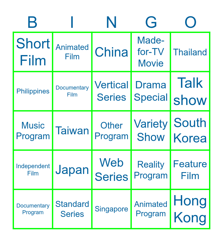 This bingo card has a free space and 24 words: Japan, Standard Series, Vertical Series, Documentary Program, Thailand, Short Film, Philippines, Animated Film, Variety Show, Web Series, Drama Special, Music Program, Reality Program, Feature Film, Documentary Film, Animated Program, South Korea, China, Talk show, Taiwan, Hong Kong, Independent Film, Made-for-TV Movie and Singapore.
