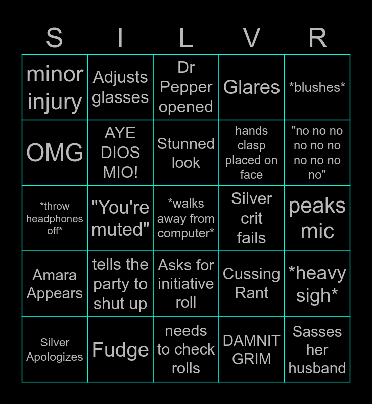 This bingo card has a free space and 29 words: Silver Apologizes, Gray Waves, "You're muted", *sings to music no one else can hear*, minor injury, Dr Pepper opened, AYE DIOS MIO!, tells the party to shut up, Silver crit fails, Fudge, peaks mic, Sasses her husband, needs to check rolls, DAMNIT GRIM, "no no no no no no no no no no", So... how do you wanna do this?, Asks for initiative roll, Amara Appears, *blushes*, *throw headphones off*, Cussing Rant, *searches for NPC names*, hands clasp placed on face, OMG, Glares, Adjusts glasses, *heavy sigh*, Stunned look and hits mic.