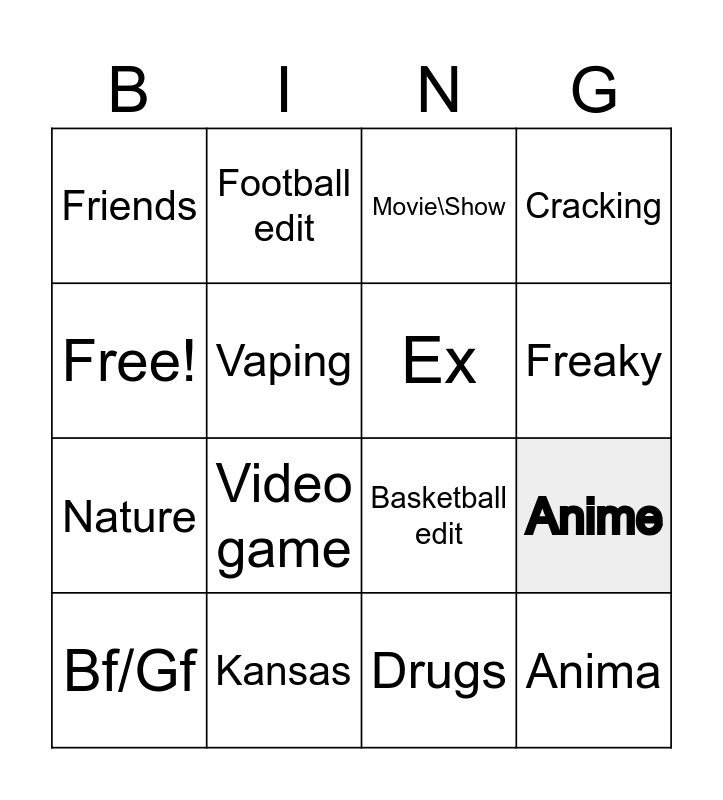 This bingo card has 16 words: Kansas, Anime, Movie\Show, Friends, Nature, Football edit, Basketball edit, Drugs, Free!, Vaping, Bf/Gf, Cracking, Video game, Freaky, Ex and Anima.