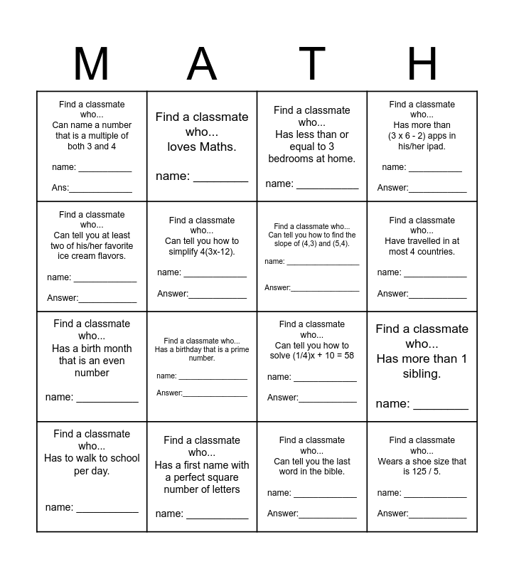 This bingo card has 16 words: Find a classmate who... Has a first name with a perfect square number of letters name: ___________, Find a classmate who... Has more than 1 sibling. name: ________, Find a classmate who... Has less than or equal to 3 bedrooms at home. name: ___________, Find a classmate who... Can name a number that is a multiple of both 3 and 4 name: ___________ Ans:_____________, Find a classmate who... Has a birth month that is an even number name: ___________, Find a classmate who... loves Maths. name: ________, Find a classmate who... Can tell you how to solve (1/4)x + 10 = 58 name: _____________ Answer:____________, Find a classmate who... Can tell you the last word in the bible. name: _____________ Answer:____________, Find a classmate who... Can tell you at least two of his/her favorite ice cream flavors. name: _____________ Answer:____________, Find a classmate who... Can tell you how to simplify 4(3x-12). name: _____________ Answer:____________, Find a classmate who... Has to walk to school per day. name: ___________, Find a classmate who... Has more than (3 x 6 - 2) apps in his/her ipad. name: ___________ Answer:____________, Find a classmate who... Has a birthday that is a prime number. name: _________________ Answer:________________, Find a classmate who... Have travelled in at most 4 countries. name: _____________ Answer:____________, Find a classmate who... Can tell you how to find the slope of (4,3) and (5,4). name: __________________ Answer:_________________ and Find a classmate who... Wears a shoe size that is 125 / 5. name: _____________ Answer:____________.