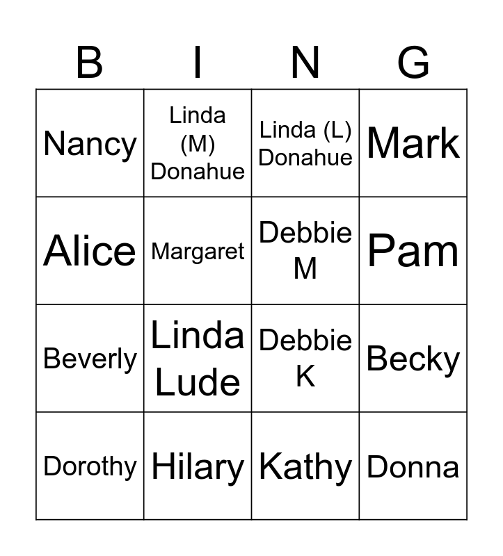 This bingo card has 28 words: Dean, Denise C, Beverly, Jill, Margaret, Linda (L) Donahue, Linda (M) Donahue, Donna, Hilary, Linda Gulla, Debbie K, Mark, Bob, Karen, Linda Lude, Carol, Denise M, Debbie M, Pam, Paula, Nancy, Sue, Dorothy, Becky, Kathy, Marge, Alice and Kathleen.