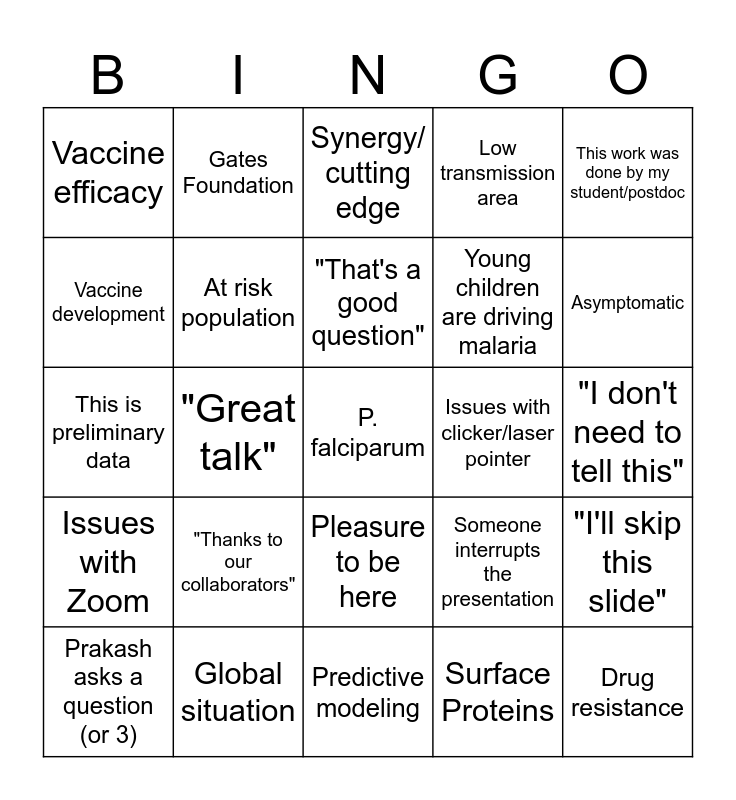 This bingo card has a free space and 28 words: "I'll skip this slide", Flow cytometry, Young children are driving malaria, Surface Proteins, Vaccine development, Synergy/ cutting edge, Gates Foundation, Issues with Zoom, Issues with clicker/laser pointer, Prakash asks a question (or 3), This is preliminary data, Low transmission area, Global situation, Predictive modeling, Asymptomatic, "I hope you can appreciate", "Thanks to our collaborators", At risk population, "That's a good question", Pleasure to be here, Vaccine efficacy, Mosquito, Drug resistance, "Great talk", "I don't need to tell this", Someone interrupts the presentation, This work was done by my student/postdoc and Runs over time.