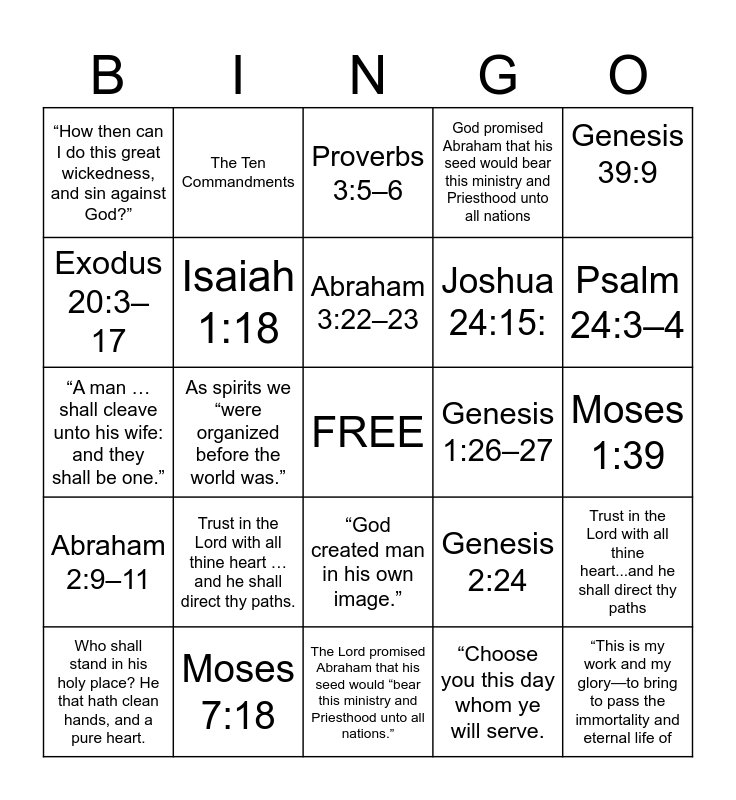 This bingo card has a free space and 26 words: “God created man in his own image.”, “Choose you this day whom ye will serve., Abraham 3:22–23, Moses 7:18, Genesis 39:9, “How then can I do this great wickedness, and sin against God?”, Exodus 20:3–17, The Ten Commandments, Moses 1:39, Genesis 2:24, Joshua 24:15:, “A man … shall cleave unto his wife: and they shall be one.”, Trust in the Lord with all thine heart...and he shall direct thy paths, Who shall stand in his holy place? He that hath clean hands, and a pure heart., As spirits we “were organized before the world was.”, “The Lord called his people Zion, because they were of one heart and one mind.”, God promised Abraham that his seed would bear this ministry and Priesthood unto all nations, Abraham 2:9–11, Proverbs 3:5–6, “This is my work and my glory—to bring to pass the immortality and eternal life of, Psalm 24:3–4, The Lord promised Abraham that his seed would “bear this ministry and Priesthood unto all nations.”, Genesis 1:26–27, Trust in the Lord with all thine heart … and he shall direct thy paths., Isaiah 1:18 and Though your sins be as scarlet, they shall be as white as snow.