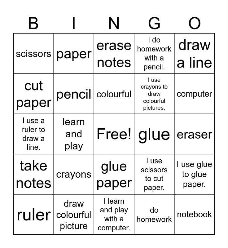 This bingo card has a free space and 24 words: crayons, draw colourful picture, colourful, ruler, draw a line, scissors, cut paper, paper, glue, glue paper, I use crayons to draw colourful pictures., I use a ruler to draw a line., I use scissors to cut paper., I use glue to glue paper., pencil, do homework, eraser, erase notes, computer, learn and play, notebook, take notes, I do homework with a pencil. and I learn and play with a computer..