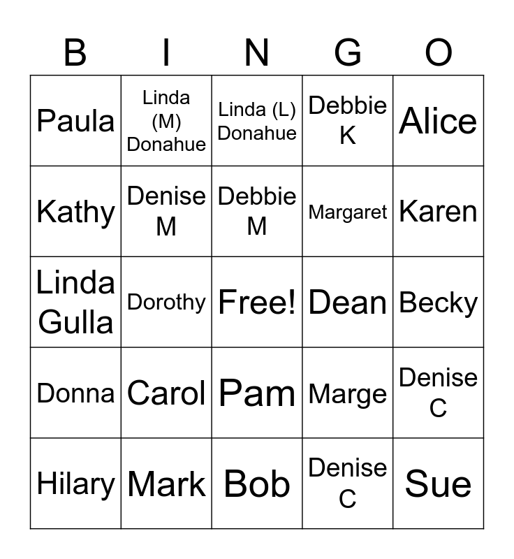 This bingo card has a free space and 28 words: Denise C, Jill, Margaret, Denise C, Kathy, Linda (L) Donahue, Linda (M) Donahue, Donna, Dean, Hilary, Linda Gulla, Debbie K, Mark, Bob, Karen, Linda Lude, Carol, Denise M, Debbie M, Pam, Paula, Nancy, Sue, Dorothy, Becky, Marge, Alice and Kathleen.
