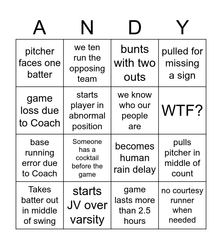 This bingo card has 17 words: Takes batter out in middle of swing, starts JV over varsity, bunts with two outs, pulled for missing a sign, base running error due to Coach, starts player in abnormal position, becomes human rain delay, WTF?, game loss due to Coach, Someone has a cocktail before the game, game lasts more than 2.5 hours, pulls pitcher in middle of count, pitcher faces one batter, we ten run the opposing team, we know who our people are, no courtesy runner when needed and starts a "non" pitcher.