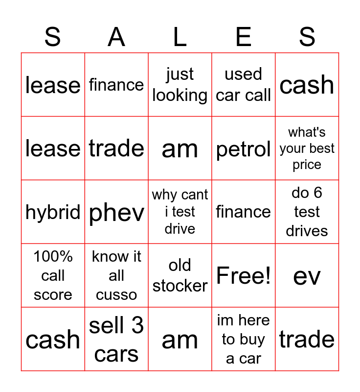 This bingo card has 25 words: know it all cusso, am, am, cash, cash, lease, lease, finance, finance, old stocker, petrol, hybrid, Free!, ev, trade, trade, do 6 test drives, just looking, what's your best price, phev, why cant i test drive, sell 3 cars, 100% call score, used car call and im here to buy a car.