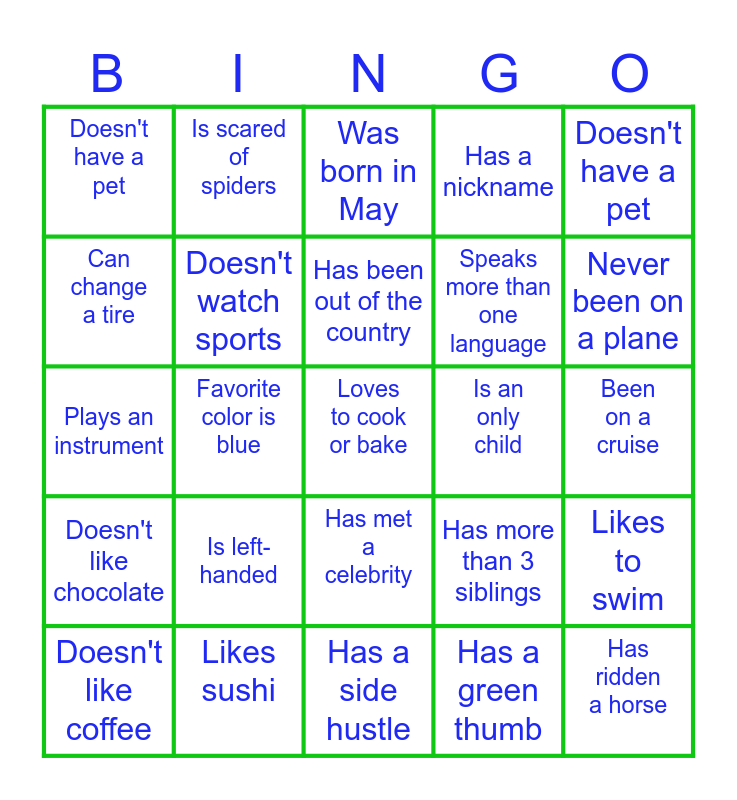 This bingo card has 25 words: Is left-handed, Has a side hustle, Has been out of the country, Doesn't like coffee, Doesn't have a pet, Doesn't have a pet, Can change a tire, Is scared of spiders, Is an only child, Has met a celebrity, Speaks more than one language, Plays an instrument, Has more than 3 siblings, Likes to swim, Doesn't watch sports, Has ridden a horse, Been on a cruise, Was born in May, Never been on a plane, Favorite color is blue, Loves to cook or bake, Likes sushi, Doesn't like chocolate, Has a nickname and Has a green thumb.