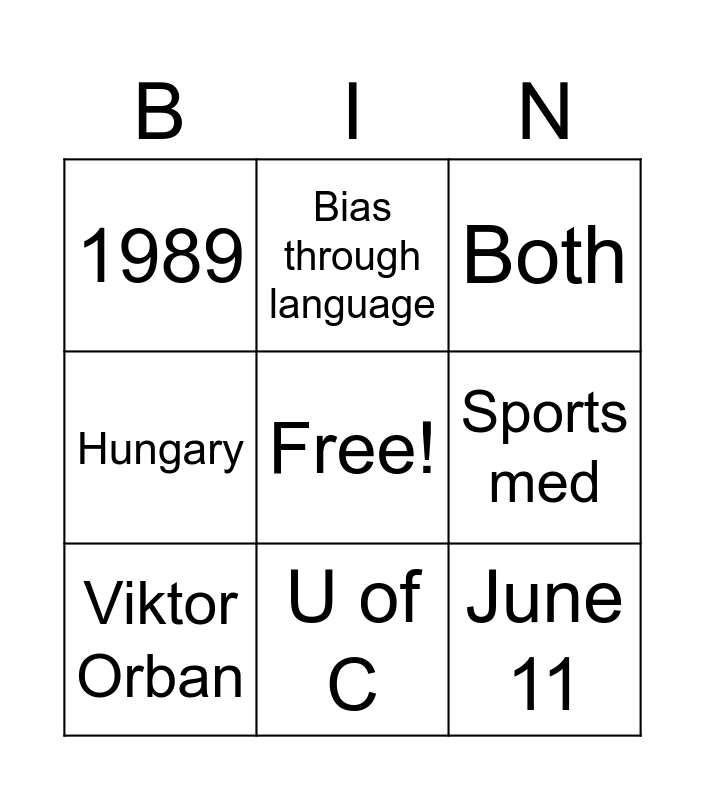 This bingo card has a free space and 31 words: Ancient Greece, Association, Free and Fair Elections, 1948, 1989, Both, Viktor Orban, 16 years, Peter Magyar, Corruption, Captured, Left, Liberalism, Authoritarianism, Rule of Law, Thomas Hobbes, John Locke, Joey, Peanut, Banana & Peanut butter, June 11, Constitutional Court, June 16, Bias through language, Bias through pictures, Sports med, Hungary, BBC, April 12, U of C and Relevance & related to authoritarianism.