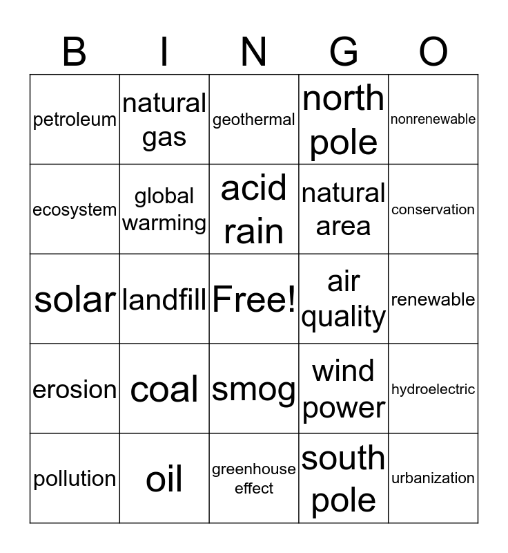 This bingo card has a free space and 24 words: coal, oil, acid rain, pollution, nonrenewable, petroleum, ecosystem, natural gas, air quality, smog, natural area, solar, wind power, hydroelectric, global warming, south pole, renewable, geothermal, conservation, landfill, urbanization, erosion, north pole and greenhouse effect.