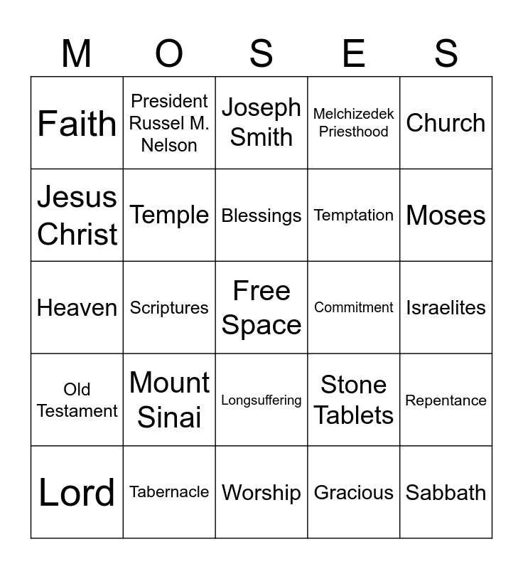 This bingo card has a free space and 36 words: Covenant, Exodus, Commandments, Temple, Stone Tablets, Old Testament, Blessings, God, Church, Obedient, Scriptures, Melchizedek Priesthood, Treasure, Commitment, Moses, Faith, Sacred, Mount Sinai, Sabbath, Joseph Smith, Israelites, Repentance, Tabernacle, Lord, Worship, President Russel M. Nelson, Heaven, Sin, Temptation, Jesus Christ, Segullah, Merciful, Gracious, Longsuffering, Goodness and Truth.