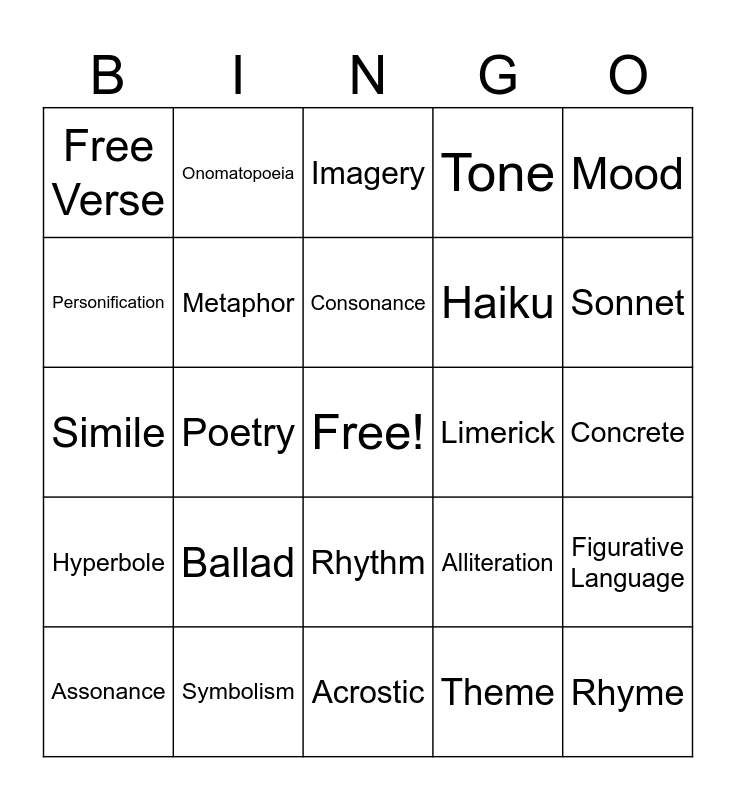 This bingo card has a free space and 24 words: Ballad, Symbolism, Consonance, Assonance, Mood, Free Verse, Personification, Onomatopoeia, Limerick, Rhythm, Haiku, Simile, Alliteration, Figurative Language, Metaphor, Theme, Concrete, Imagery, Sonnet, Poetry, Rhyme, Hyperbole, Tone and Acrostic.