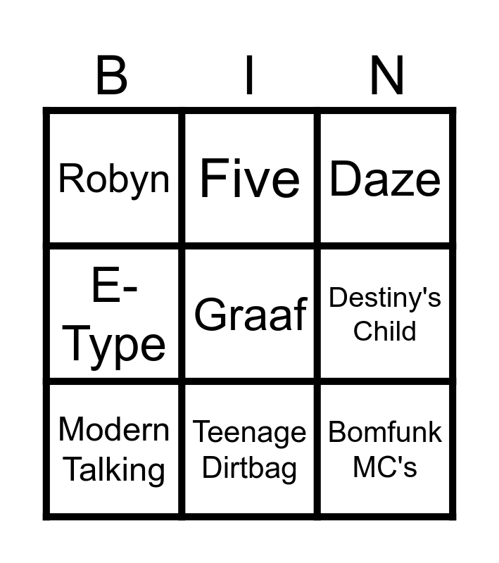 This bingo card has 11 words: Bomfunk MC's, Teenage Dirtbag, Graaf, Modern Talking, Five, Daze, Destiny's Child, Oasis, E-Type, Robyn and Red Hot Chilipeppers.