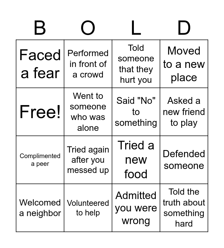 This bingo card has 16 words: Volunteered to help, Defended someone, Told someone that they hurt you, Faced a fear, Complimented a peer, Performed in front of a crowd, Tried a new food, Admitted you were wrong, Free!, Went to someone who was alone, Welcomed a neighbor, Moved to a new place, Tried again after you messed up, Asked a new friend to play, Said "No" to something and Told the truth about something hard.