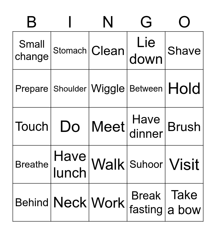 This bingo card has a free space and 27 words: Suhoor, Arm, Between, Work, Prepare, Clean, Stomach, Breathe, Have dinner, Visit, Touch, Lie down, Behind, Neck, Hold, Invite, Shoulder, Wiggle, Have lunch, Small change, Brush, Break fasting, Do, Take a bow, Walk, Shave and Thirtieth.