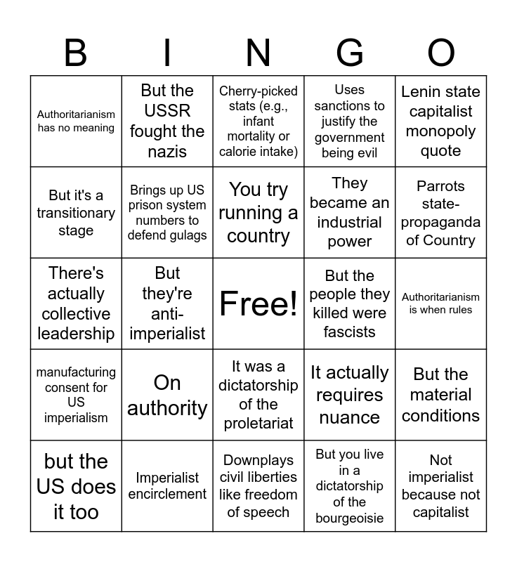 This bingo card has a free space and 24 words: On authority, Imperialist encirclement, You try running a country, but the US does it too, Lenin state capitalist monopoly quote, Authoritarianism has no meaning, But it's a transitionary stage, But the USSR fought the nazis, But the people they killed were fascists, It was a dictatorship of the proletariat, They became an industrial power, There's actually collective leadership, It actually requires nuance, But the material conditions, Brings up US prison system numbers to defend gulags, But you live in a dictatorship of the bourgeoisie, Authoritarianism is when rules, Cherry-picked stats (e.g., infant mortality or calorie intake), Parrots state-propaganda of Country, But they're anti-imperialist, Not imperialist because not capitalist, manufacturing consent for US imperialism, Uses sanctions to justify the government being evil and Downplays civil liberties like freedom of speech.
