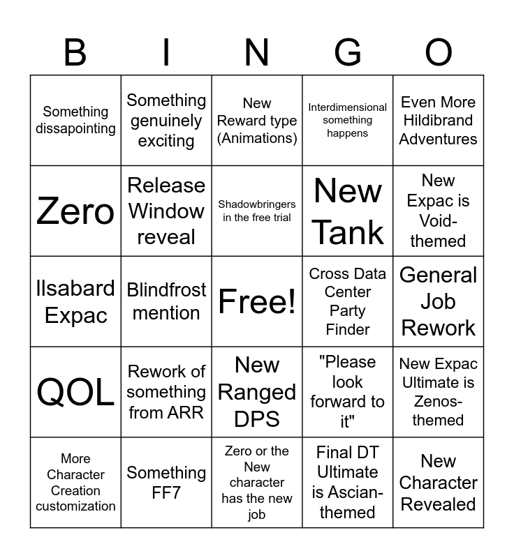 This bingo card has a free space and 24 words: Rework of something from ARR, Something FF7, Shadowbringers in the free trial, More Character Creation customization, Even More Hildibrand Adventures, Something dissapointing, Zero, Something genuinely exciting, Cross Data Center Party Finder, New Ranged DPS, New Tank, llsabard Expac, "Please look forward to it", New Expac Ultimate is Zenos-themed, Release Window reveal, Final DT Ultimate is Ascian-themed, General Job Rework, New Reward type (Animations), New Expac is Void-themed, Blindfrost mention, New Character Revealed, QOL, Interdimensional something happens and Zero or the New character has the new job.