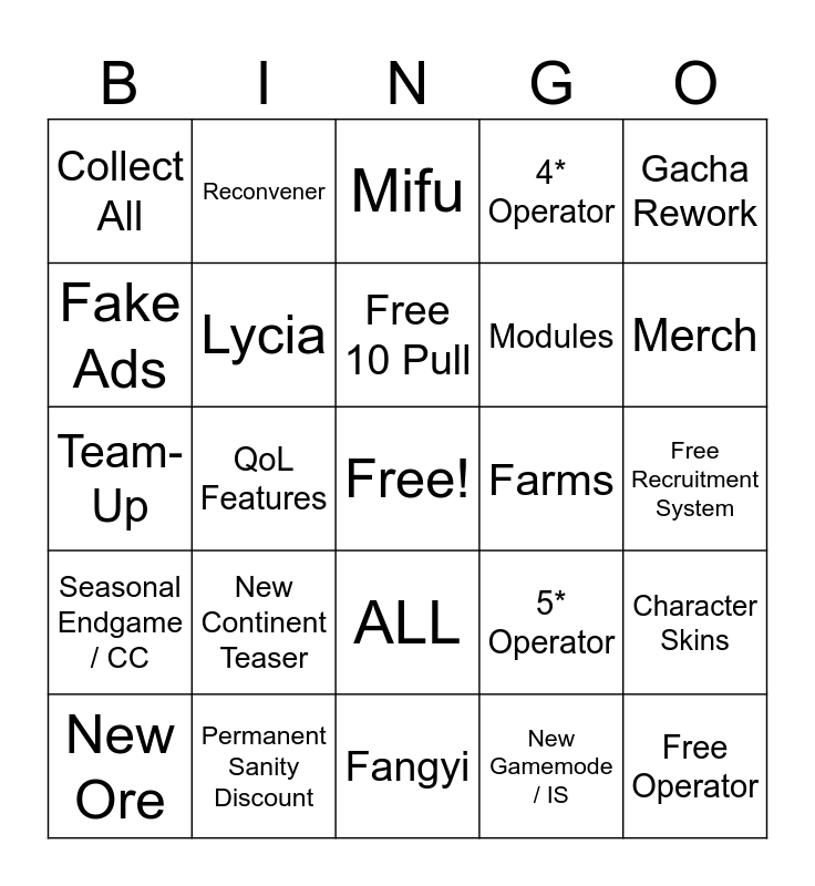 This bingo card has a free space and 24 words: New Ore, New Continent Teaser, Free 10 Pull, New Gamemode / IS, Gacha Rework, Collect All, Reconvener, Mifu, Farms, Free Recruitment System, Team-Up, Lycia, 5* Operator, Character Skins, Fake Ads, Permanent Sanity Discount, Fangyi, 4* Operator, Merch, Seasonal Endgame / CC, QoL Features, ALL, Modules and Free Operator.