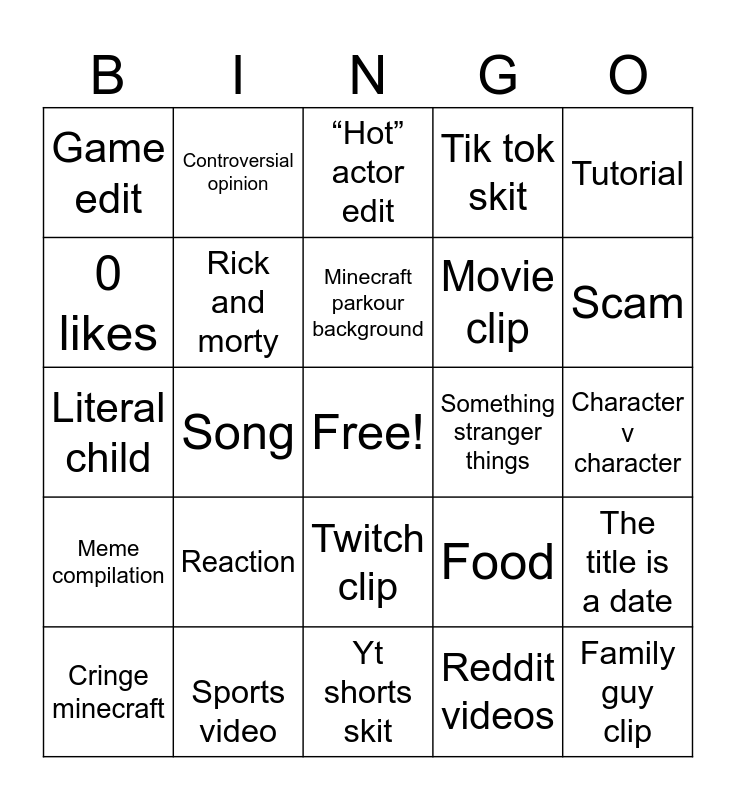 This bingo card has a free space and 24 words: Reaction, Sports video, Minecraft parkour background, Cringe minecraft, Tutorial, Game edit, 0 likes, Controversial opinion, Something stranger things, Twitch clip, Movie clip, Literal child, Food, The title is a date, Rick and morty, Reddit videos, Character v character, “Hot” actor edit, Scam, Song, Family guy clip, Meme compilation, Tik tok skit and Yt shorts skit.