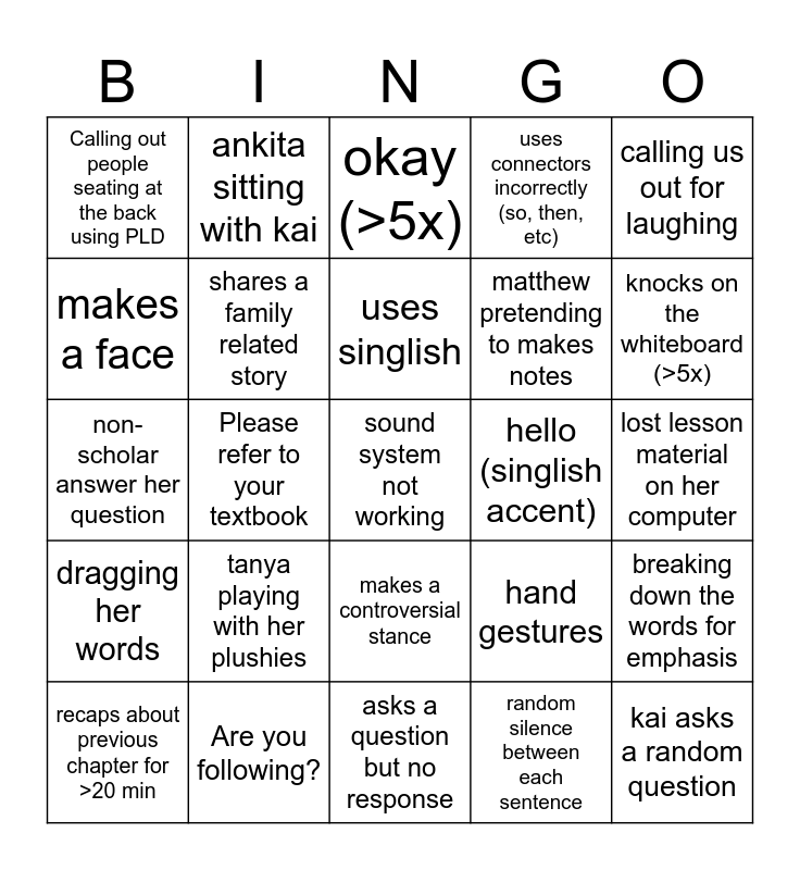 This bingo card has a free space and 30 words: Are you following?, shh (>4x), Please refer to your textbook, I want to bring you through.., Calling out people seating at the back using PLD, okay (>5x), shares a family related story, makes a controversial stance, hello (singlish accent), asks a question but no response, lost lesson material on her computer, kai asks a random question, random silence between each sentence, make an example out of a student, knocks on the whiteboard (>5x), repeats the same word in a sentence (>3x), hand gestures, dragging her words, tanya playing with her plushies, calling us out for laughing, non-scholar answer her question, talk about how good her notes are, ankita sitting with kai, matthew pretending to makes notes, makes a face, uses connectors incorrectly (so, then, etc), breaking down the words for emphasis, recaps about previous chapter for >20 min, uses singlish and why do i hear a lot of mumbling.