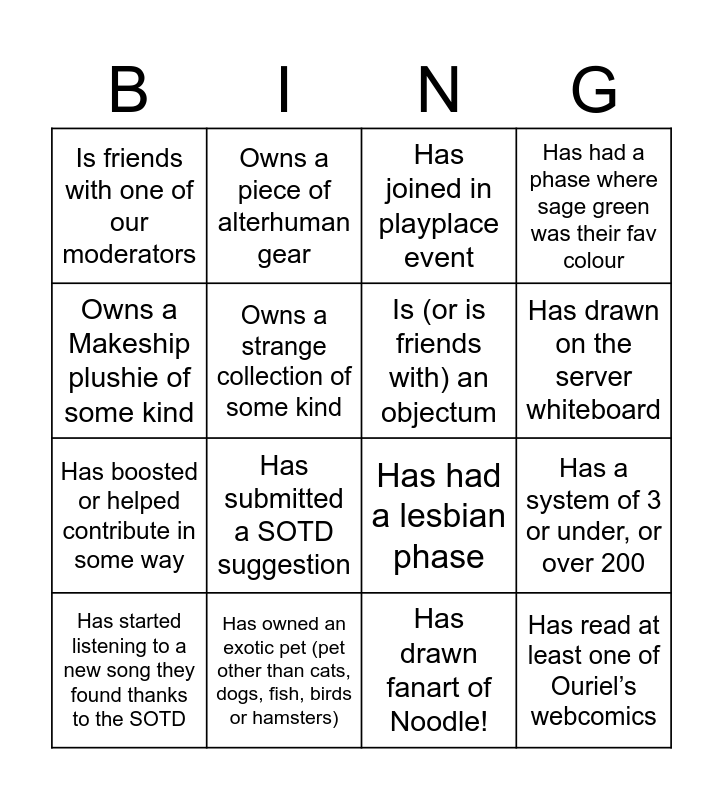 This bingo card has 16 words: Has owned an exotic pet (pet other than cats, dogs, fish, birds or hamsters), Has a system of 3 or under, or over 200, Has joined in playplace event, Is friends with one of our moderators, Has boosted or helped contribute in some way, Owns a piece of alterhuman gear, Has had a lesbian phase, Has drawn fanart of Noodle!, Owns a Makeship plushie of some kind, Owns a strange collection of some kind, Has started listening to a new song they found thanks to the SOTD, Has had a phase where sage green was their fav colour, Has submitted a SOTD suggestion, Has drawn on the server whiteboard, Is (or is friends with) an objectum and Has read at least one of Ouriel’s webcomics.
