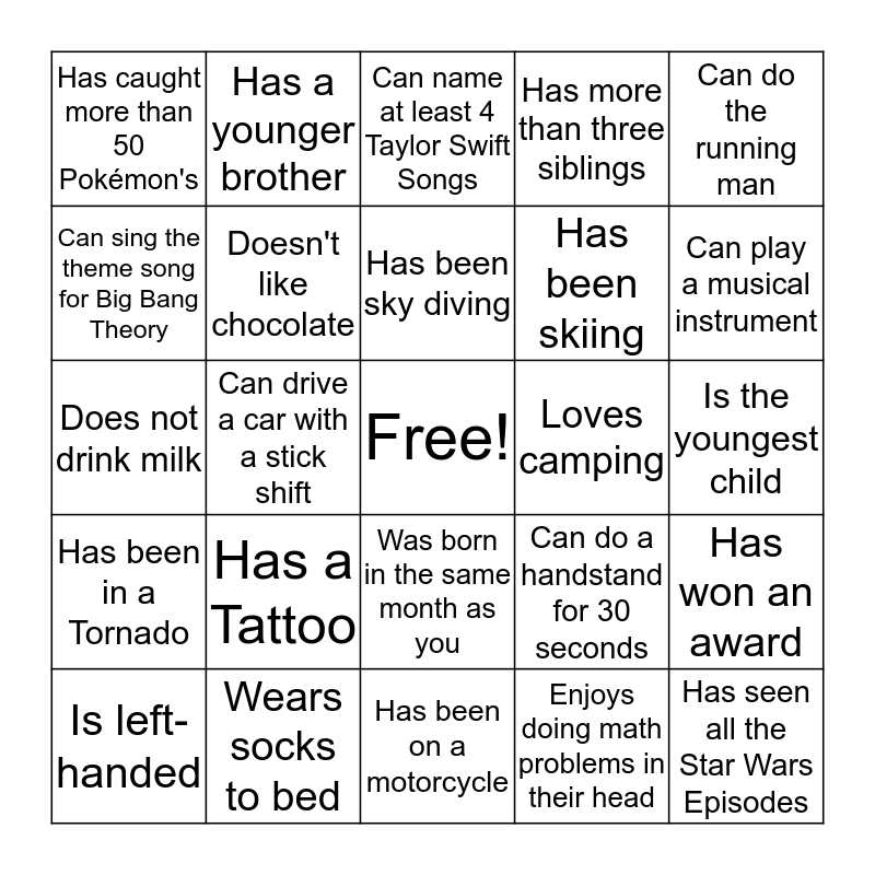 This bingo card has a free space and 24 words: Has a Tattoo, Wears socks to bed, Has been sky diving, Is left-handed, Can do the running man, Has caught more than 50 Pokémon's, Can sing the theme song for Big Bang Theory, Has a younger brother, Loves camping, Was born in the same month as you, Has been skiing, Does not drink milk, Can do a handstand for 30 seconds, Has won an award, Doesn't like chocolate, Enjoys doing math problems in their head, Is the youngest child, Can name at least 4 Taylor Swift Songs, Can play a musical instrument, Can drive a car with a stick shift, Has seen all the Star Wars Episodes, Has been in a Tornado, Has more than three siblings and Has been on a motorcycle.