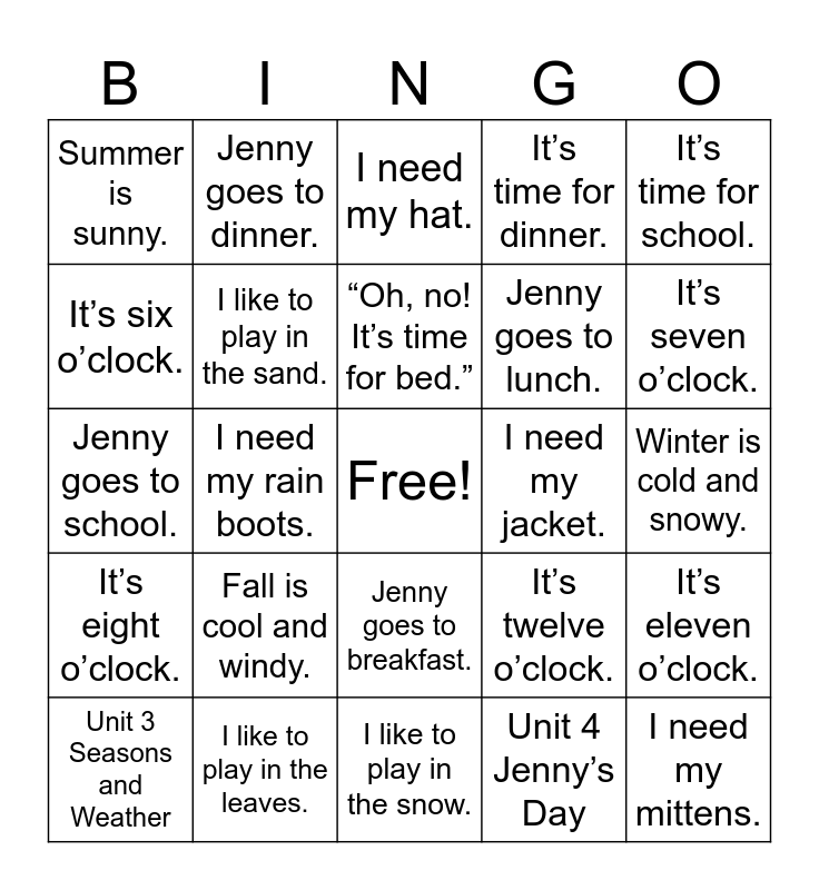 This bingo card has a free space and 29 words: Unit 3 Seasons and Weather, Spring is rainy., I need my rain boots., I like to play in the rain., Summer is sunny., I need my hat., I like to play in the sand., Fall is cool and windy., I need my jacket., I like to play in the leaves., Winter is cold and snowy., I need my mittens., I like to play in the snow., Unit 4 Jenny’s Day, It’s seven o’clock., It’s time for breakfast., Jenny goes to breakfast., It’s eight o’clock., It’s time for school., Jenny goes to school., It’s twelve o’clock., It’s time for lunch., Jenny goes to lunch., It’s six o’clock., It’s time for dinner., Jenny goes to dinner., It’s eleven o’clock., “Oh, no! It’s time for bed.” and Jenny goes to bed..