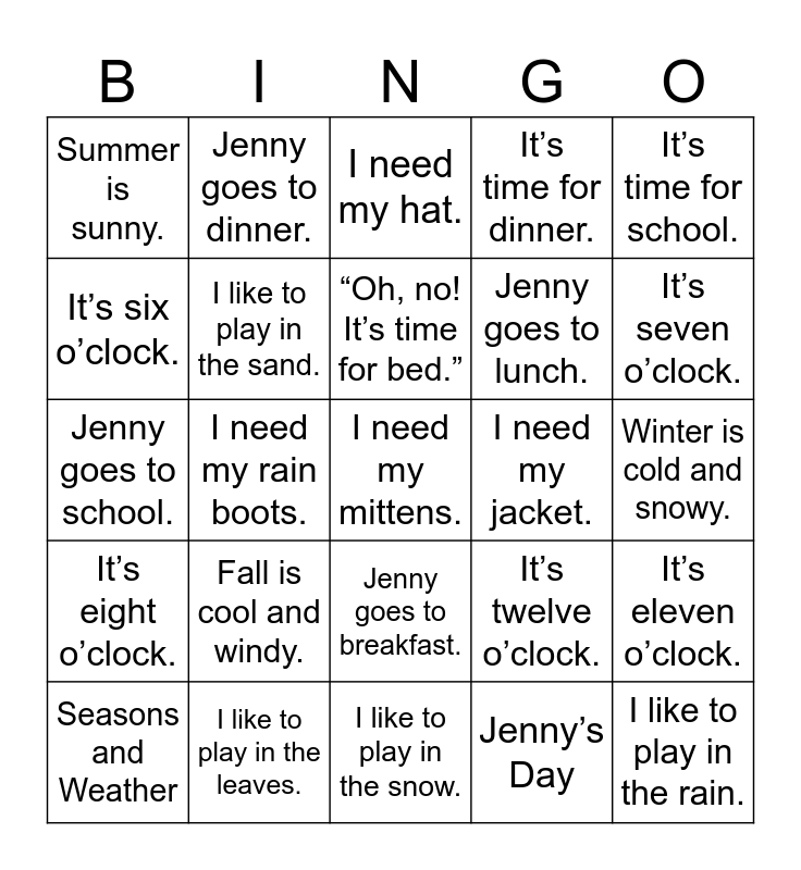 This bingo card has 29 words: Seasons and Weather, Spring is rainy., I need my rain boots., I like to play in the rain., Summer is sunny., I need my hat., I like to play in the sand., Fall is cool and windy., I need my jacket., I like to play in the leaves., Winter is cold and snowy., I need my mittens., I like to play in the snow., Jenny’s Day, It’s seven o’clock., It’s time for breakfast., Jenny goes to breakfast., It’s eight o’clock., It’s time for school., Jenny goes to school., It’s twelve o’clock., It’s time for lunch., Jenny goes to lunch., It’s six o’clock., It’s time for dinner., Jenny goes to dinner., It’s eleven o’clock., “Oh, no! It’s time for bed.” and Jenny goes to bed..
