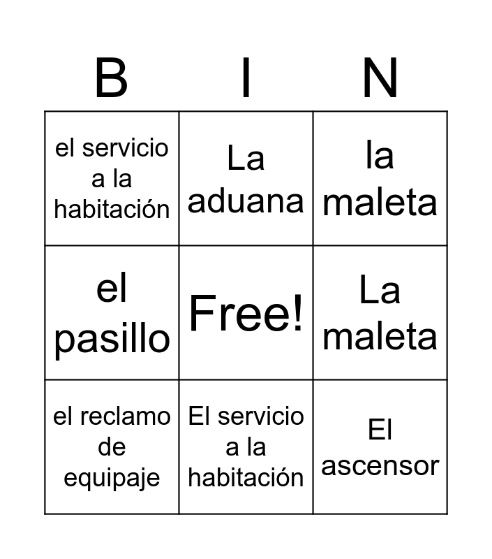 This bingo card has a free space and 17 words: el asiento, la sala de espera, la maleta, el servicio a la habitación, la taquilla, el pasillo, el ascensor, el reclamo de equipaje, El servicio a la habitación, La maleta, El pasillo, La sala de espera, El ascensor, La aduana, El reclamo de equipaje, La taquilla and El asiento.