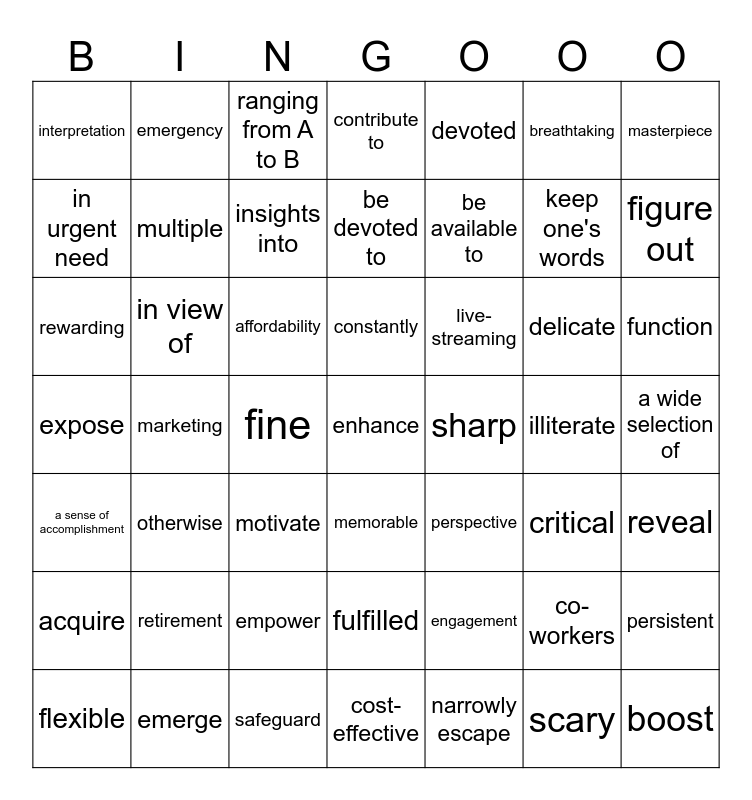 This bingo card has 49 words: co-workers, keep one's words, narrowly escape, marketing, affordability, a wide selection of, emergency, safeguard, breathtaking, memorable, masterpiece, contribute to, delicate, live-streaming, retirement, illiterate, in urgent need, figure out, persistent, devoted, be available to, fine, interpretation, multiple, flexible, insights into, function, emerge, constantly, in view of, boost, sharp, acquire, empower, expose, perspective, critical, reveal, rewarding, motivate, fulfilled, a sense of accomplishment, enhance, cost-effective, be devoted to, ranging from A to B, engagement, otherwise and scary.