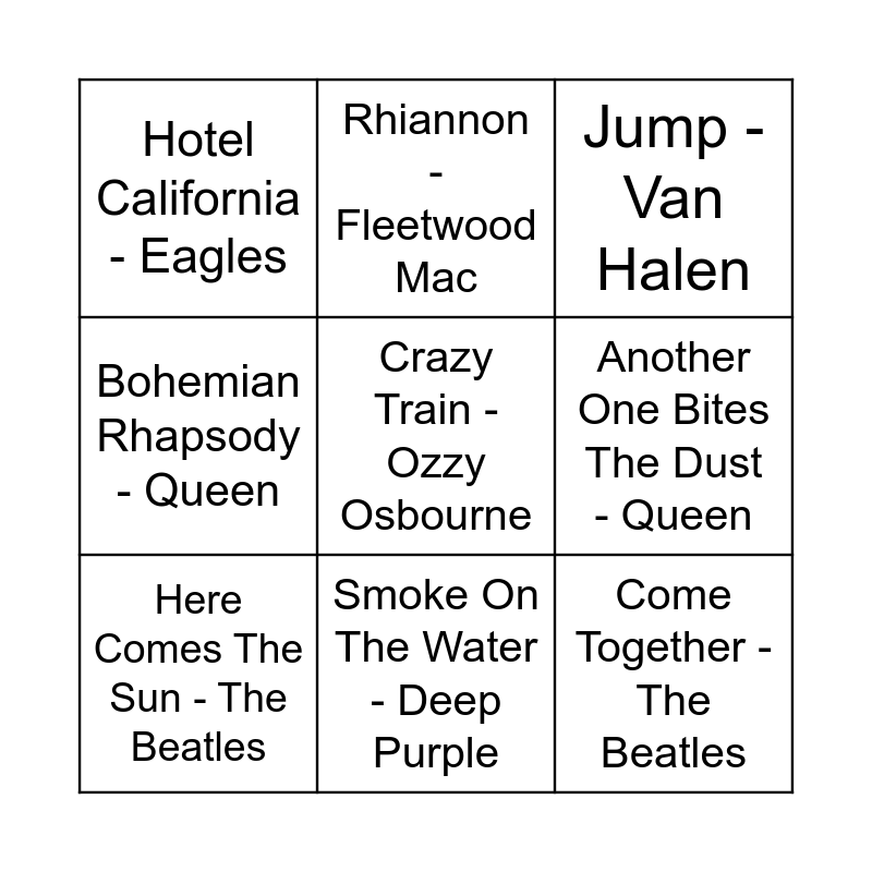 This bingo card has 40 words: Don't Stop Believin' - Journey, Beautiful Day - U2, Let It Be - The Beatles, Here Comes The Sun - The Beatles, Panama - Van Halen, Sweet Child O'Mine - Guns N' Roses, Smoke On The Water - Deep Purple, Come Sail Away - Styx, Crazy Train - Ozzy Osbourne, Wheel In The Sky - Journey, Free Ride - The Edgar Winter Group, Bohemian Rhapsody - Queen, Slow Ride - Foghat, Thunderstruck - AC/DC, Carry On Wayward Son - Kansas, Bad Reputation - Joan Jett, More Than A Feeling - Boston, Hotel California - Eagles, Gimme Shelter - The Rolling Stones, Jump - Van Halen, Stairway To Heaven - Led Zeppelin, Sweet Home Alabama - Lynyrd Skynyrd, Come Together - The Beatles, Another One Bites The Dust - Queen, (Oh) Pretty Woman - Van Halen, Just What I Needed - The Cars, Sharp Dressed Man - ZZ Top, Hey You - Pink Floyd, Bennie And The Jets - Elton John, Rock & Roll Band - Boston, Cold As Ice - Foreigner, Juke Box Hero - Foreigner, School's Out - Alice Cooper, Barracuda - Heart, Livin' On A Prayer - Bon Jovi, You Give Love A Bad Name - Bon Jovi, Africa - Toto, Pour Some Sugar On Me - Def Leppard, Rhiannon - Fleetwood Mac and Gypsy - Fleetwood Mac.