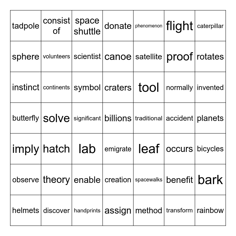 This bingo card has 49 words: benefit, proof, method, solve, symbol, planets, consist of, handprints, flight, emigrate, caterpillar, donate, normally, tool, theory, accident, sphere, rotates, bark, phenomenon, satellite, significant, tadpole, volunteers, helmets, scientist, invented, discover, craters, continents, rainbow, traditional, observe, enable, butterfly, leaf, occurs, bicycles, instinct, lab, creation, imply, billions, assign, canoe, space shuttle, spacewalks, hatch and transform.