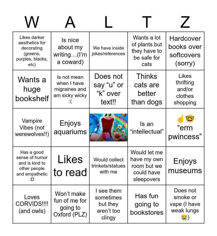 This bingo card has a free space and 24 words: Likes to read, Won’t make fun of me for going to Oxford (PLZ), Does not say “u” or “k” over text!!, Loves CORVIDS!!!! (and owls), Hardcover books over softcovers (sorry), Likes darker aesthetics for decorating (greens, purples, blacks, etc), Wants a huge bookshelf, Is nice about my writing…(I’m a coward), Is an “intellectual”, Would collect trinkets/statues with me, Thinks cats are better than dogs, Vampire Vibes (not werewolves!!), Would let me have my own room but we could have sleepovers, Enjoys museums, Is not mean when I have migraines and am sicky wicky :(, Has fun going to bookstores, ☝️🤓 “erm pwincess”, We have inside jokes/references, Likes thrifting and/or clothes shopping, Enjoys aquariums, Does not smoke or vape (I have weak lungs 😭), Has a good sense of humor and is kind to other people and empathetic :D, Wants a lot of plants but they have to be safe for cats and I see them sometimes but they aren’t too clingy.