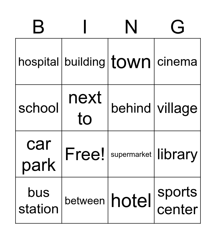 This bingo card has 18 words: Free!, sports center, town, hospital, supermarket, cinema, bus station, building, village, car park, hotel, school, library, next to, behind, in front of, between and opposite.