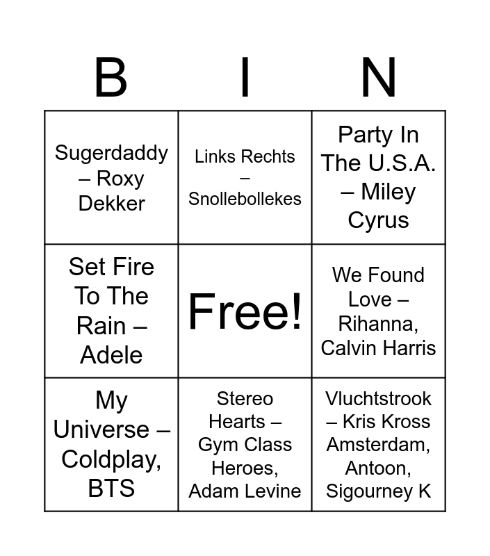 This bingo card has a free space and 36 words: Watermelon Sugar - Harry Styles, Amsterdam – Flemming, Ik Neem Je Mee – Gers Pardoel, My Universe – Coldplay, BTS, Senorita – Shaw Mendes, Camila Cabello, Bagagedrager – Gers Pardoel, Sef, Stereo Hearts – Gym Class Heroes, Adam Levine, Hotelschool – Antoon, Vluchtstrook – Kris Kross Amsterdam, Antoon, Sigourney K, Automatisch – Flemming, Ladada – Claude, Set Fire To The Rain – Adele, Flowers – Miley Curus, Unstoppable – Sia, Loser – Roxy Dekker, Sugerdaddy – Roxy Dekker, Hot N Cold – Katy Perry, Before You Go – Lewis Capaldi, Shivers – Ed Sheeran, Party In The U.S.A. – Miley Cyrus, Europapa – Joost, Luchtballon - Joost, Fries Volkslied – Blauhuster Dakkapel, Afraid Of The Dark – Chef’Special, Amigo - Chef’Special, Links Rechts – Snollebollekes, Entourage – Bankzitters, Uitslovers – Samuel Welten, Bankzitters, Girl on Fire – Alicia Keys, We Found Love – Rihanna, Calvin Harris, Heartbeat – Davine Michelle, Snap – Rosa Linn, Ordinary – Alex Warren, Beautiful Things – Benson Boone, Sorry I’m Here For Someone Else – Benson Boone and Viva La Vida – Coldplay.