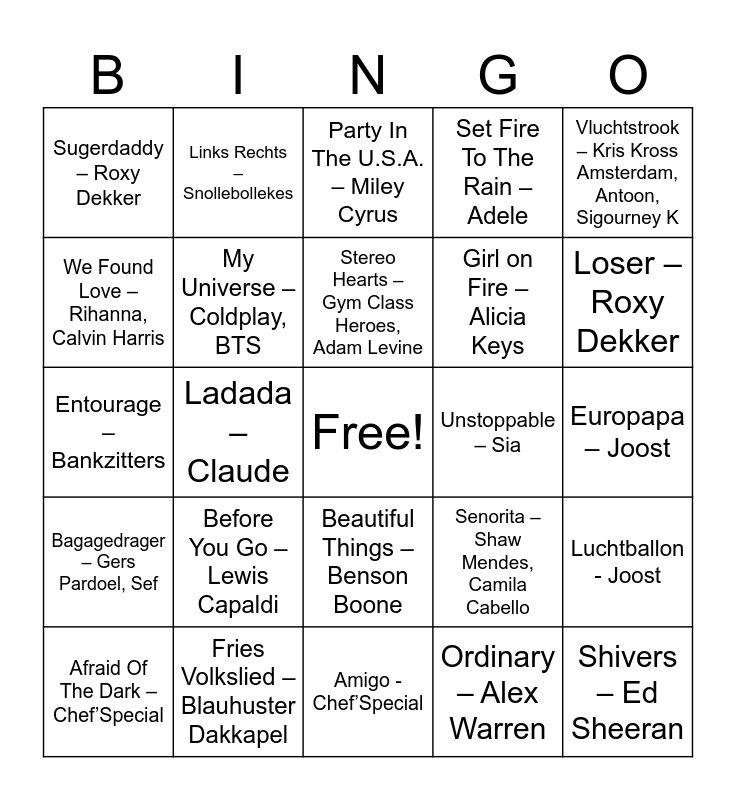 This bingo card has a free space and 36 words: Watermelon Sugar - Harry Styles, Amsterdam – Flemming, Ik Neem Je Mee – Gers Pardoel, My Universe – Coldplay, BTS, Senorita – Shaw Mendes, Camila Cabello, Bagagedrager – Gers Pardoel, Sef, Stereo Hearts – Gym Class Heroes, Adam Levine, Hotelschool – Antoon, Vluchtstrook – Kris Kross Amsterdam, Antoon, Sigourney K, Automatisch – Flemming, Ladada – Claude, Set Fire To The Rain – Adele, Flowers – Miley Curus, Unstoppable – Sia, Loser – Roxy Dekker, Sugerdaddy – Roxy Dekker, Hot N Cold – Katy Perry, Before You Go – Lewis Capaldi, Shivers – Ed Sheeran, Party In The U.S.A. – Miley Cyrus, Europapa – Joost, Luchtballon - Joost, Fries Volkslied – Blauhuster Dakkapel, Afraid Of The Dark – Chef’Special, Amigo - Chef’Special, Links Rechts – Snollebollekes, Entourage – Bankzitters, Uitslovers – Samuel Welten, Bankzitters, Girl on Fire – Alicia Keys, We Found Love – Rihanna, Calvin Harris, Heartbeat – Davine Michelle, Snap – Rosa Linn, Ordinary – Alex Warren, Beautiful Things – Benson Boone, Sorry I’m Here For Someone Else – Benson Boone and Viva La Vida – Coldplay.